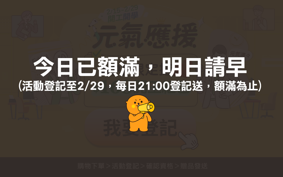 ※ 註一:本活動依下單時間計算為準。登記時,系統會自動將活動期間至今符合登記資格的訂單一併登記,但登記後若有新訂單,記得要再次再來登記才有效唷!最終以「符合資格且登記成功次數」進行贈品發放。
